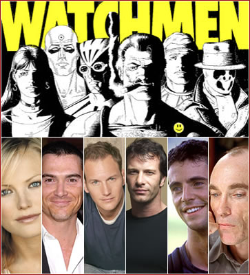 Cast for the movie from left to right: Malin Akerman as Sally Jupiter, Billy Crudup as Dr. Manhattan, Patrick Wilson as Nite Owl II (he was wonderful in Hard Candy), Thomas Jane (rumored) as the Comedian, Matthew Goode as Ozymandias, and Jackie Earle Haley as Rorschach.