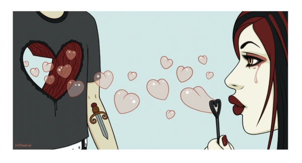 A recurring motif in her work is a person with a stylized heart-shaped hole through his chest in the place of an actual heart. I purchased and had Tara sign this print at the show this year:
